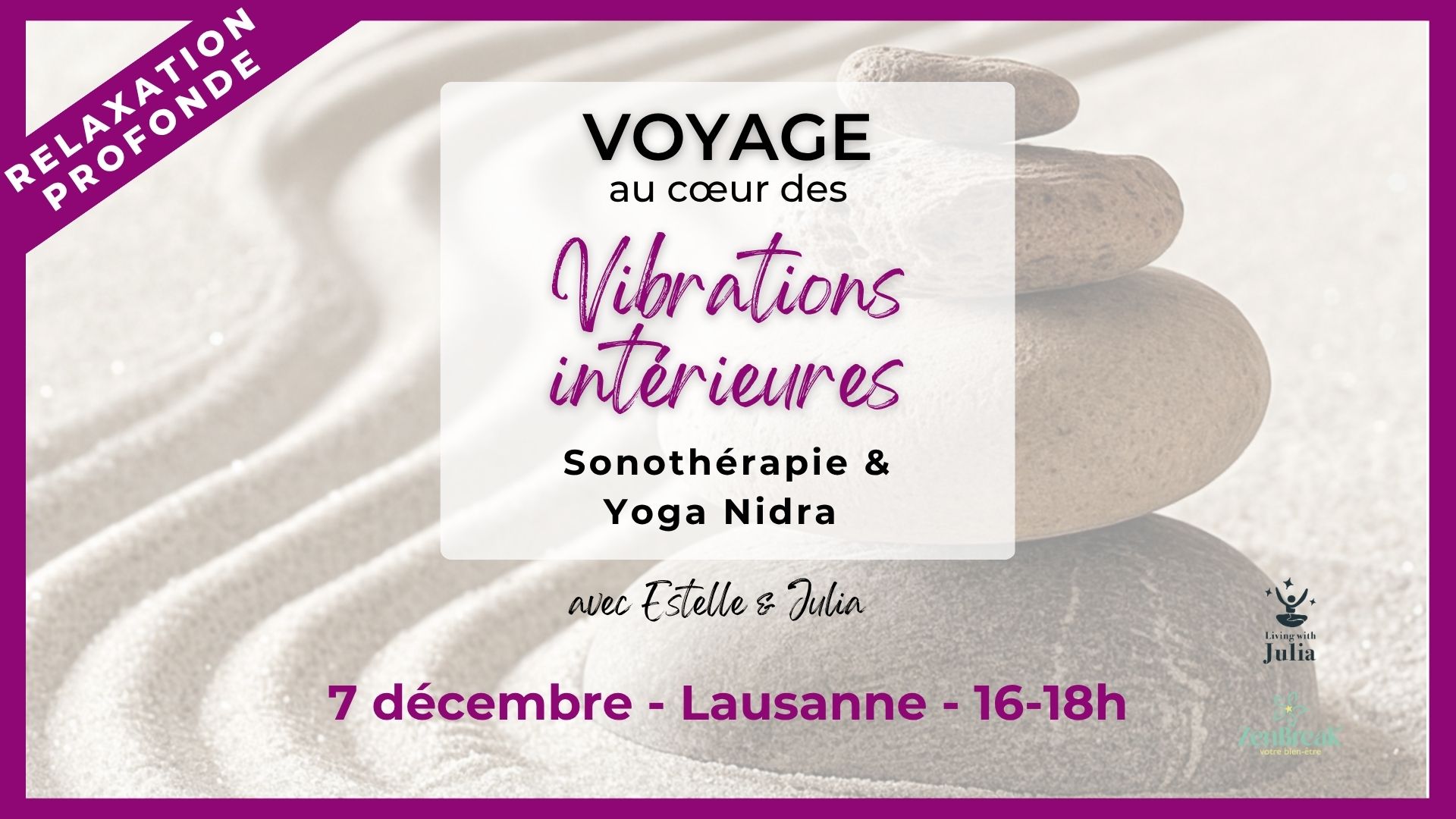 Nous serons ravies de t’accueillir pour ce voyage au cœur des vibrations intérieures, entre sons, silence et lumière – une parenthèse ressourçante pour te recentrer et te régénérer avant la nouvelle année.